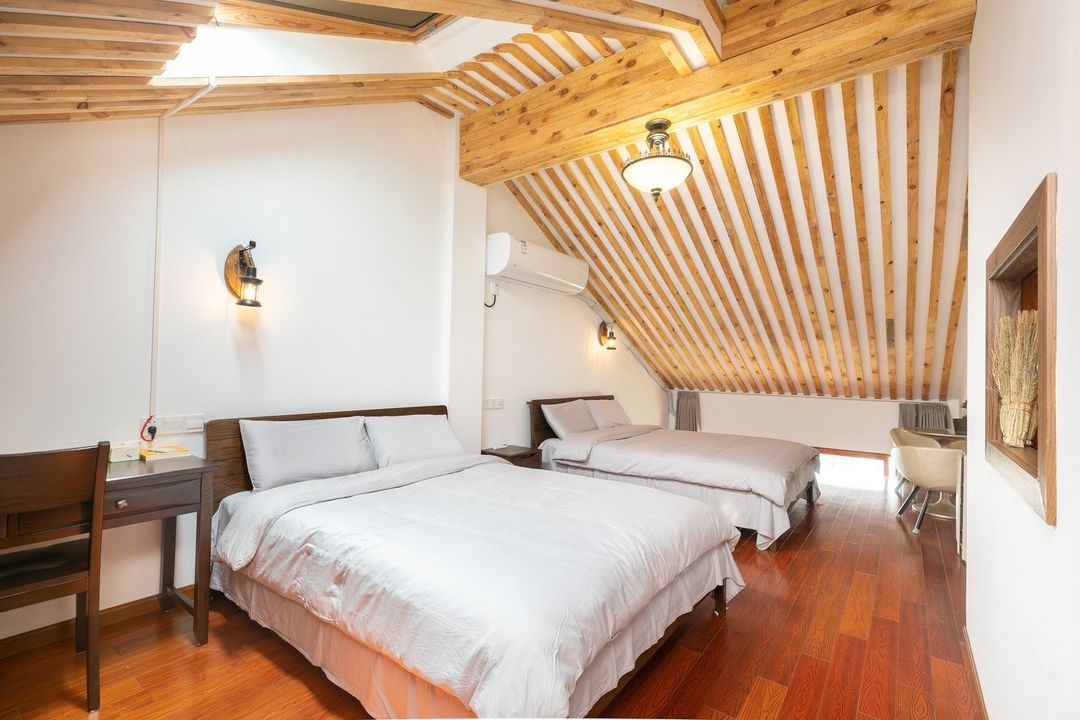 Tucked away in Chongming's fishing port, this Nordic-style hideaway boasts white walls, black-framed windows, and stunning Yangtze River Bridge views. BBQ in the garden, stroll with your pet, or watch egrets glide past fishing boats at the private beach area. Rooms feature星级bedding and solid wood furniture, plus thoughtful touches like a tea room and laundry. At night, admire the bridge's light ribbons from your balcony! With farm picking, eco-tours and insta-worthy spots, plus a 'stay 5 nights get 1 free' deal - your riverside escape awaits!