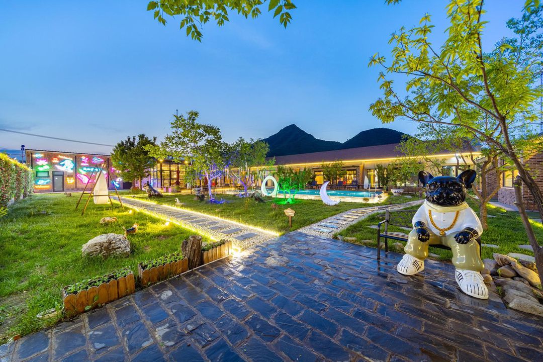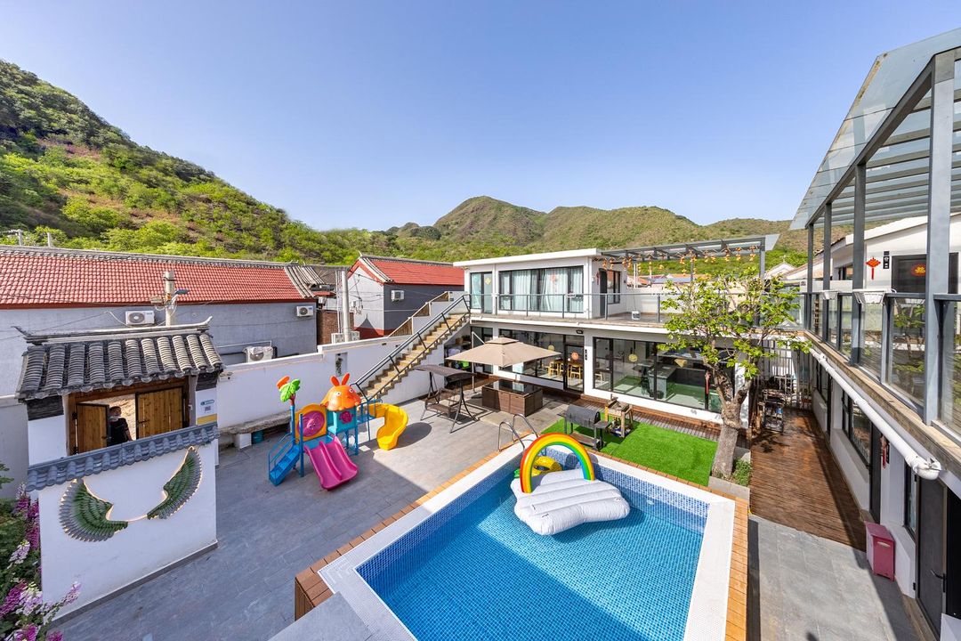 Need a break from the city? This place is perfect! Surrounded by lush mountains, it features a heated pool and private hot springs for ultimate relaxation. Traveling with kids? They'll love the children's reading area, climbing zone, and play area. At night, head to the three-level stargazing terrace for unforgettable moments. Fancy a BBQ? The picnic area and kitchen are at your disposal. With KTV, mahjong tables, and a water park, fun never stops. Pet-friendly too! Plus, it's close to attractions like the Mutianyu Great Wall for easy exploring.