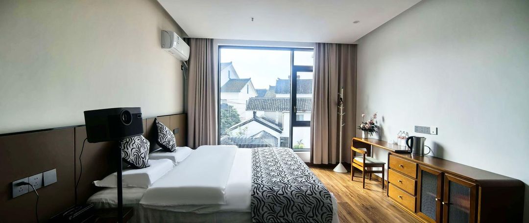 The Wang Du Pavilion Suite at Han Shan Villa offers panoramic views of the main stone arch bridge, ancient village rooftops, and the distant silhouette of Huxiu Pagoda. Floor-to-ceiling windows adjust automatically with sunrise and sunset light, enhancing the visual harmony between nature and interior design. This room is ideal for those seeking both serenity and artistic inspiration.