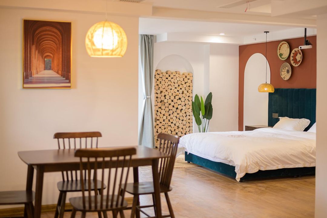 Escape urban hustle in this mountain retreat where Japanese teppanyaki under skylights meets panoramic Chinese dining. Family-friendly with BBQ zones and play areas, rooms blend minimalist aesthetics with folk touches, featuring smart toilets and premium amenities. The crowning jewel? A 360° rooftop deck showcasing Xi'an's skyline by night. Perfect for eco-tourism seekers – whether stargazing through your suite's linen curtains or picking fresh produce from the garden, every detail whispers tranquility. (Bonus: free parking and yoga classes!)