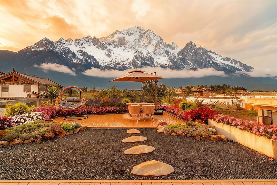 Tucked away near the ancient town, this luxurious hideaway offers the perfect escape. With over two acres of lush greenery framing the majestic snow-capped mountains, every room boasts unobstructed mountain views, allowing you to witness the breathtaking "Sunshine over Golden Mountain" spectacle. Select rooms feature private hot spring pools, where you can soak while admiring the ever-changing clouds and mountain hues—pure bliss. The hotel’s amenities are second to none, from family-friendly play areas to outdoor BBQ sites, plus concierge services like airport transfers. Whether it’s a family getaway or a romantic retreat, this is the ultimate wild luxury experience.