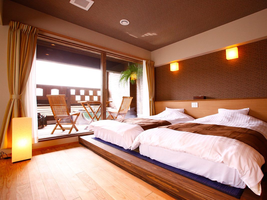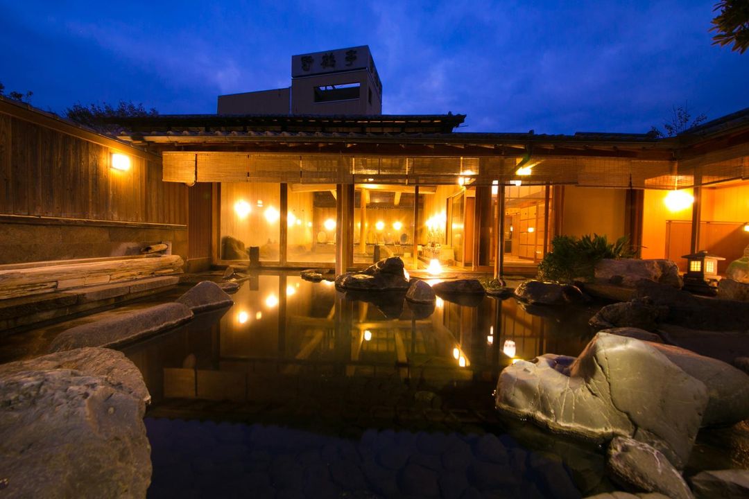 Kirishima Spa Garden Resort features private onsen suites with direct access to a tranquil garden courtyard adjacent to Kumano Park. Each room includes a heated outdoor tub surrounded by bamboo and stone lanterns. Guests enjoy quiet mornings listening to birdsong and evening relaxation under the stars. Reserve your onsen suite through the HopeGoo app for exclusive wellness packages.