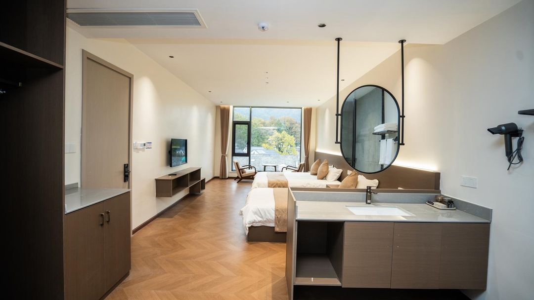 Nestled in a bamboo forest, this artistic retreat blends Eastern aesthetics with modern design. Every room features floor-to-ceiling windows, allowing you to enjoy the ever-changing bamboo scenery from your bed. With amenities like a pool, yoga area, and tea room, plus fun activities such as barbecues, outdoor movies, and KTV, it's perfect for both family trips and friend gatherings. Thoughtful touches like welcome fruits and souvenirs make you feel at home. Come experience this romantic hideaway in nature!
