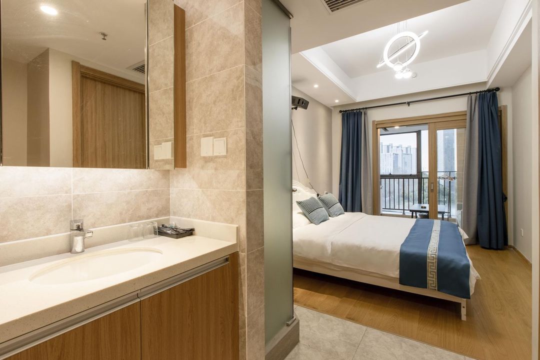 Staying at Guisu Apartment (Jian'ye Wuyue Plaza Branch) was an absolute highlight of my trip to Nanjing. The staff were incredibly helpful—when I couldn’t find the building, I called for assistance and they patiently guided me step by step, which made a huge difference. The apartment itself was thoughtfully prepared with all the essentials, even little snacks included. The layout is modern and spacious, featuring floor-to-ceiling windows that let in plenty of natural light. The projector works great, though it’s only free for 5 minutes—haha, but still perfect for quick movie nights. One thing I appreciated was the separate sink and toilet area, which added a nice touch of privacy. The bed was super comfortable, and the door lock is controlled via a mobile app—no keys needed, very convenient. Location-wise, it’s a bit far from the subway, but that’s more than offset by the convenience of being right next to Wuyue Plaza and just one crosswalk away from Wanda Plaza. There’s also a lively night market downstairs with local food stalls—perfect for a casual dinner after exploring. Overall, this place offers excellent value, a welcoming vibe, and a great base for discovering the city. Definitely recommend!