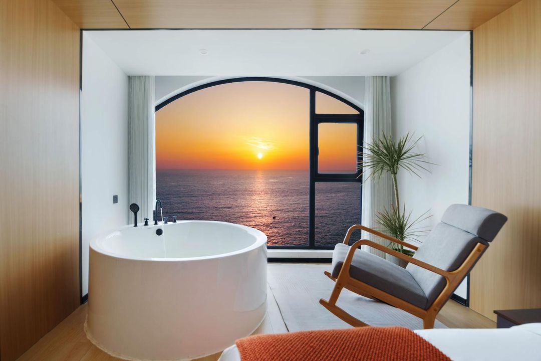 The Sunrise View Suite at Zhoushan Yuanshi Tan Seaview Resort is ideal for capturing dawn over the rugged coastline. Positioned on the eastern side of the building, these high-floor rooms feature full-height glass walls and private terraces that frame the first golden rays breaking through sea mist. Each suite includes a curated dawn breakfast hamper with fresh seafood and local tea delivered to your door. For a deeper connection with nature, join the hotel’s Morning Ecology Walk, a guided hike along the shore to observe early-morning wildlife and tidal creatures—offered exclusively to guests via HopeGoo