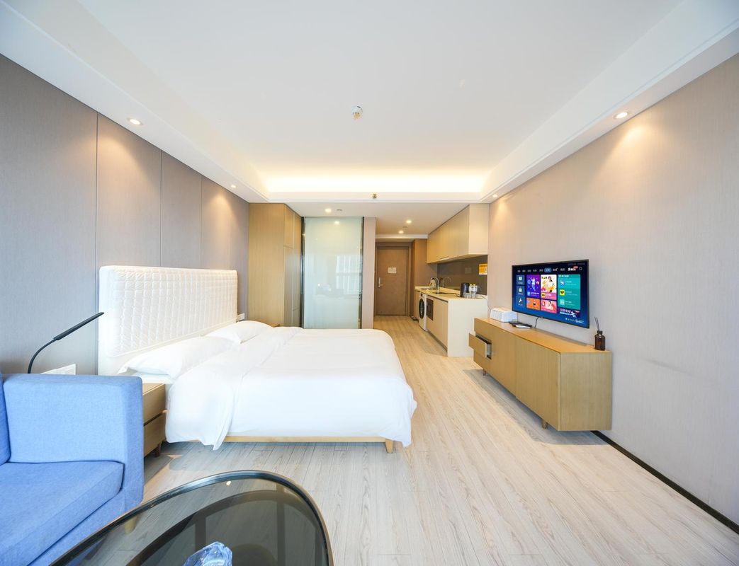 This light luxury smart hotel is definitely your best choice! Located in Laoshan District, it's surrounded by prestigious schools, shopping malls, and attractions, making it perfect for both business and leisure. The rooms feature high-end bedding and toiletries, with complimentary snacks and drinks for a truly thoughtful stay. The smart room control system offers a "smart, healthy, shared, and diverse" experience. The hotel is fully equipped with meeting rooms, children's play areas, laundry facilities, and even robot services, adding a futuristic touch. Whether for family trips or business travel, this place has it all. Come and experience it now!