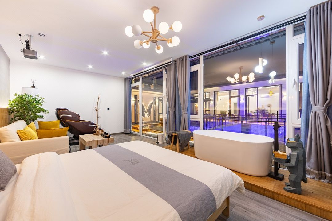This is pure vacation bliss! Enjoy private hot springs and a heated pool, or soak in your room’s zen-like tub. The loft rooms feature cozy balconies with Great Wall views, blending Moroccan charm into the design. Perfect for group gatherings with KTV, BBQ pits, and a home theater—ideal for families or friends. Plus, it’s pet-friendly, so bring your furry pals! Holidays just got way more relaxing.