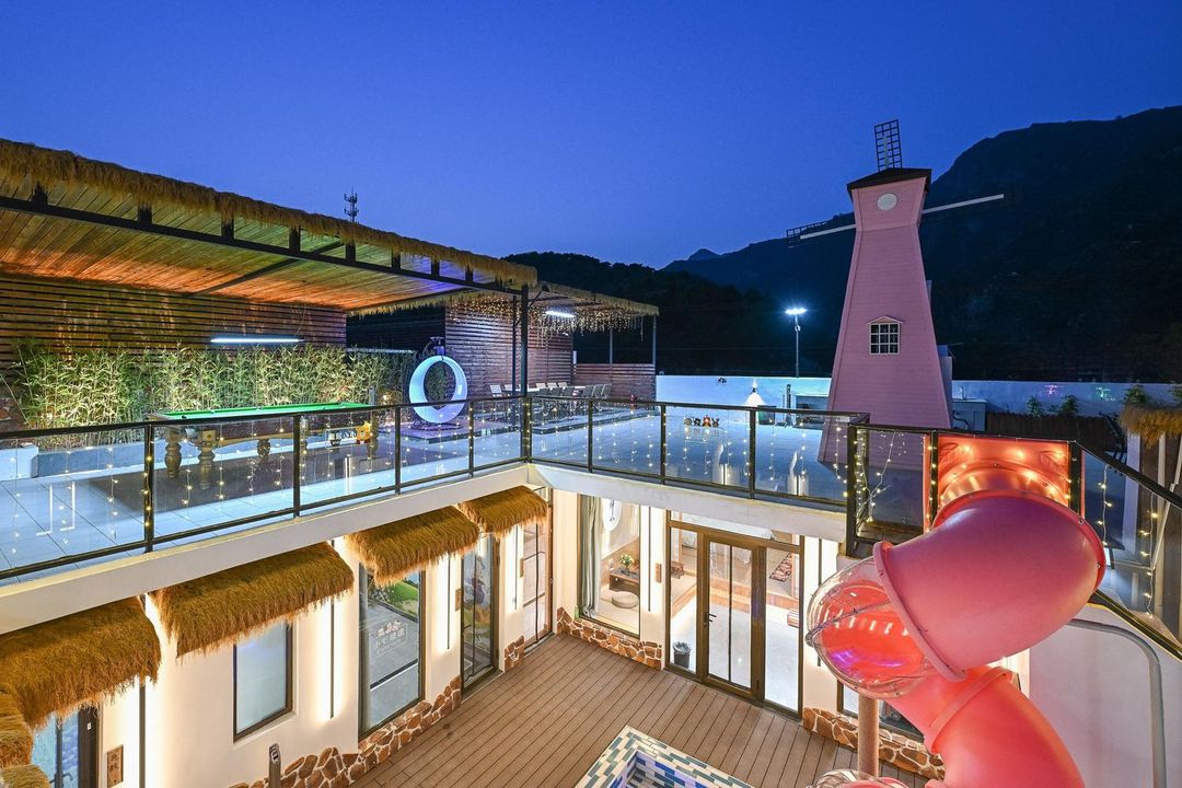 This is pure vacation bliss! Enjoy private hot springs and a heated pool, or soak in your room’s zen-like tub. The loft rooms feature cozy balconies with Great Wall views, blending Moroccan charm into the design. Perfect for group gatherings with KTV, BBQ pits, and a home theater—ideal for families or friends. Plus, it’s pet-friendly, so bring your furry pals! Holidays just got way more relaxing.