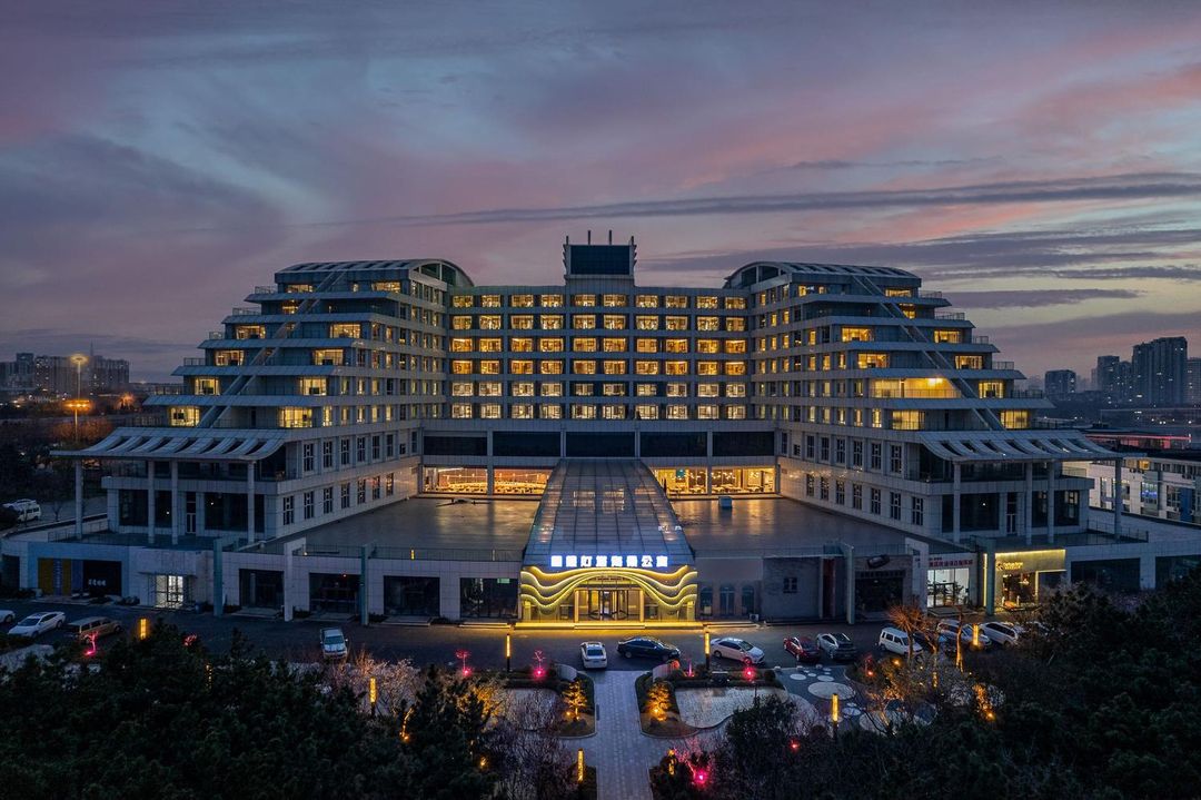 Rizhao Golden Bay Seaview Hotel boasts a stunning lobby designed with modern maritime aesthetics—floor-to-ceiling glass walls and a soaring ceiling create a seamless blend of sky and sea. A central light art installation shifts colors in the evening, making it perfect for Instagram-worthy photos. The stairwell features wave-patterned walls and mirror flooring, generating an infinite visual effect. Free photography props like sun hats and canvas bags are available. Book through HopeGoo to receive a complimentary photo session voucher.