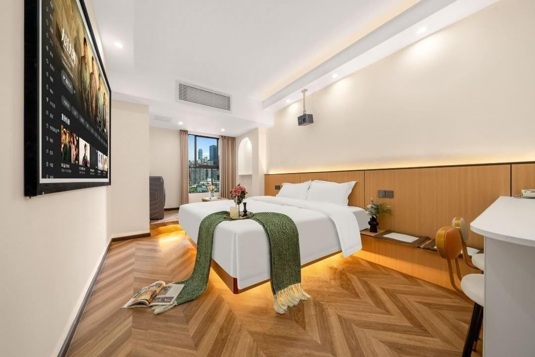 Nestled by the West Lake, this hidden gem offers a serene escape amidst tea plantations. Wake up to lush greenery and the fragrance of tea right outside your window. Located in the southwest foothills of the lake, it’s just a short walk to Longwu Tea Town and Daqing Valley’s oxygen-rich trails, with iconic spots like Yunqi Town and Meijiawu Tea Village only 15 minutes away. The rooms feature soft tones and wooden accents, with floor-to-ceiling windows framing the tea fields. Amenities include a 24-hour laundry, light dining options, and versatile meeting spaces—perfect for both business and leisure, blending convenience with tranquility.