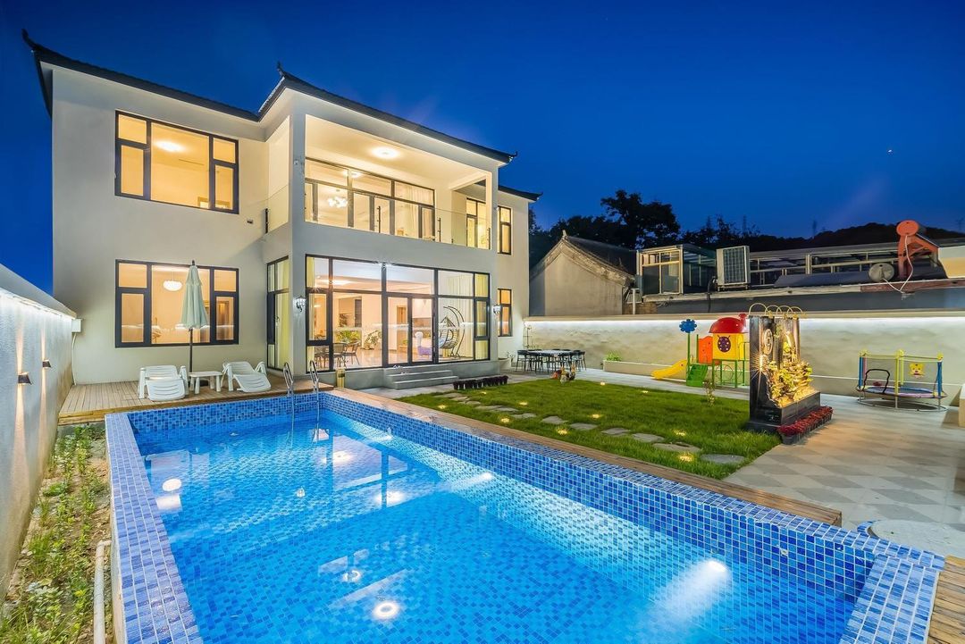 This 2000㎡ stylish creative homestay is perfect for family trips, friend gatherings, or romantic getaways! Fully equipped with luxury starlight KTV, 60㎡ indoor pool, and indoor playground that kids will love. Enjoy outdoor tent BBQ area, gazebo lounge, and glass skywalk for Instagram-worthy moments. Choose from 7 uniquely themed rooms, including round beds and family suites, accommodating up to 18 adults. Just 10 mins walk to Hongluo Temple, 3-5 mins drive to Yanqi Lake, and 15 mins to Huairou skiing &rafting spots. Pet-friendly with free parking – bring your furry friends along!