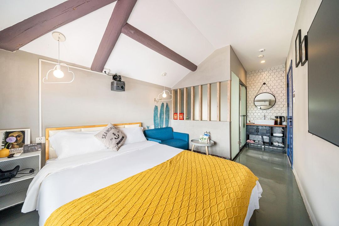 This wabi-sabi style boutique inn, designed by a Japanese architect, is a perfect escape from the city hustle! Each room features a private Japanese garden or a spacious terrace, with suites boasting 40㎡ exclusive rooftop gardens. The property offers over 500㎡ of outdoor gardens and a pool, plus 200㎡ of indoor communal spaces with coffee, afternoon tea, and DIY BBQ. Rooms are equipped with latex mattresses, tatami tea areas, 100-inch laser TVs, and deep-soaking tubs—pure luxury! Enjoy amenities like mahjong rooms, KTV, and a café. Just 20 minutes from Disneyland and the wildlife park, it’s ideal for family getaways!