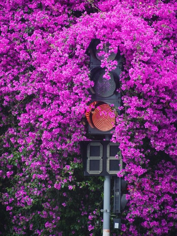 昆明街頭浪漫暴擊🌺 三角梅與紅綠燈的夢幻聯動
