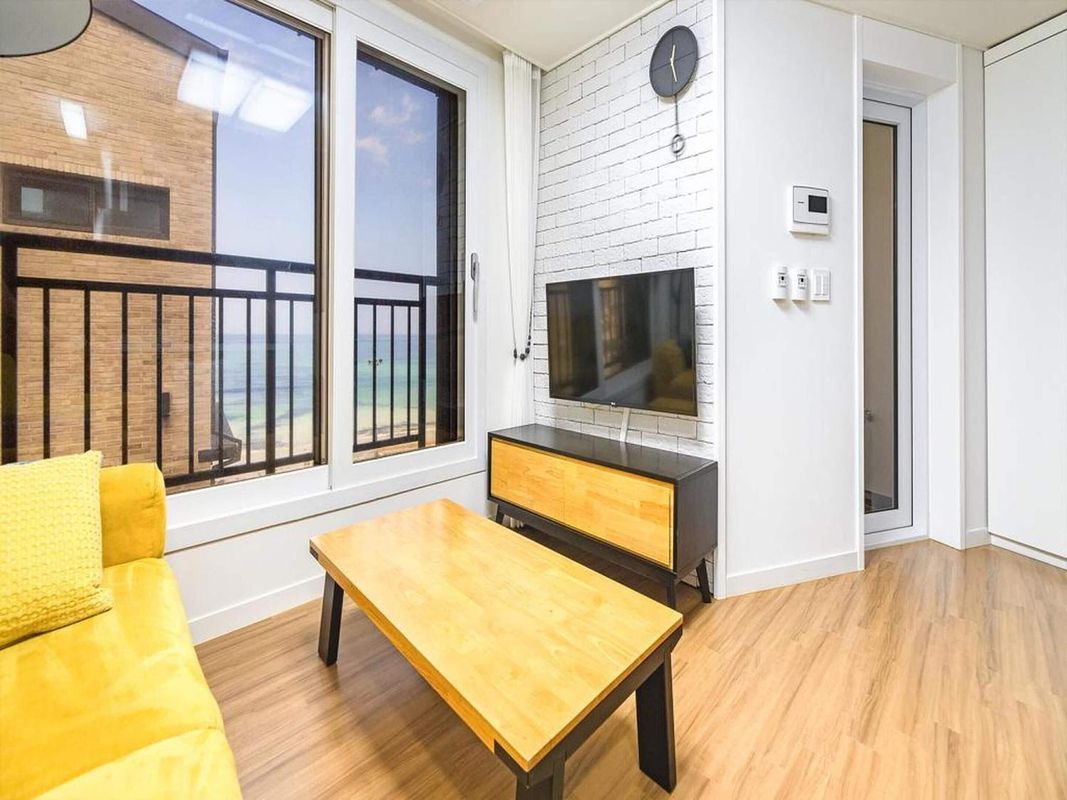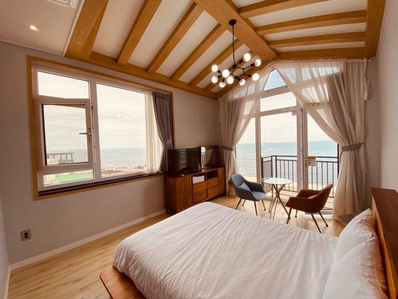 濟州漢林浦海灣別墅的海景全景房採用全落地玻璃設計,清晨可見太陽從海平面緩緩升起,照亮整片漢林浦海灘。房內設有戶外按摩浴缸,俯瞰無垠海景,搭配智能聲控系統,可自動調節燈光與背景音效。入住即贈送限量版海風香氛禮盒,讓記憶延續至旅程結束