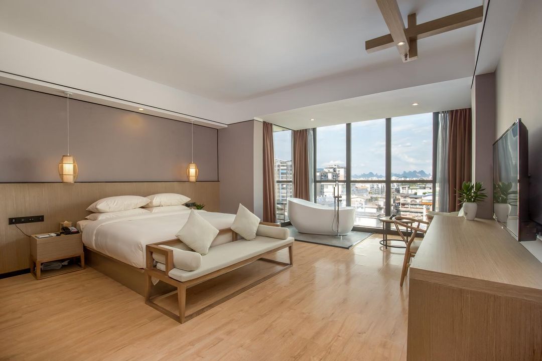 穿山岩天際觀景套房是目前唯一可俯瞰全幅喀斯特地貌的房型,位於酒店頂層,採用360度無遮攔玻璃幕牆設計,從室內即可將穿山岩、象鼻山與遠方漓江水道盡收眼底。每間套房均配備私人露台與星空觀測設備,夜晚更可見滿天星斗,是攝影愛好者與自然探索者的夢幻之選