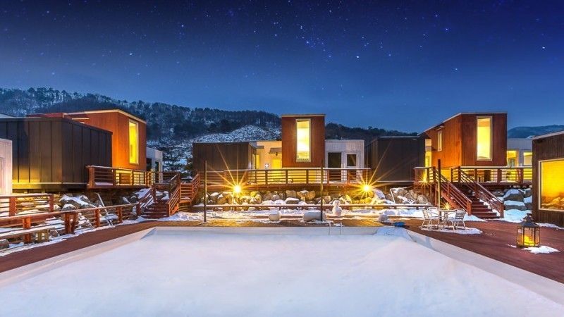 平昌元堂溪谷度假村的雪景露台房是冬季限定熱門選擇,房間配有雙層隔音玻璃與地暖系統,窗外便是銀白覆蓋的元堂溪谷與遠山雪峰。清晨時分,可於私人露台品茗觀賞霧凇奇景。度假村還提供雪地徒步裝備租借與雪屋體驗活動,讓您沉浸於韓國冬日山林詩意之中。建議透過我們平台提前預訂,確保優先選房權。