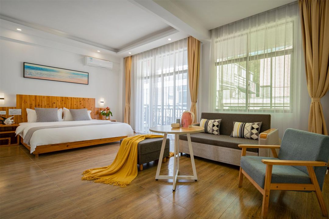 海棠灣黎族文化主題民宿融合傳統竹編工藝與現代設計,位於天下第一灣腹地,鄰近當地市集與非遺表演區。每間客房均配有黎錦床品與手工陶器擺件,入住可參與HopeGoo合作的『漁歌夜語』文化之夜活動,深度體驗海南原住民生活